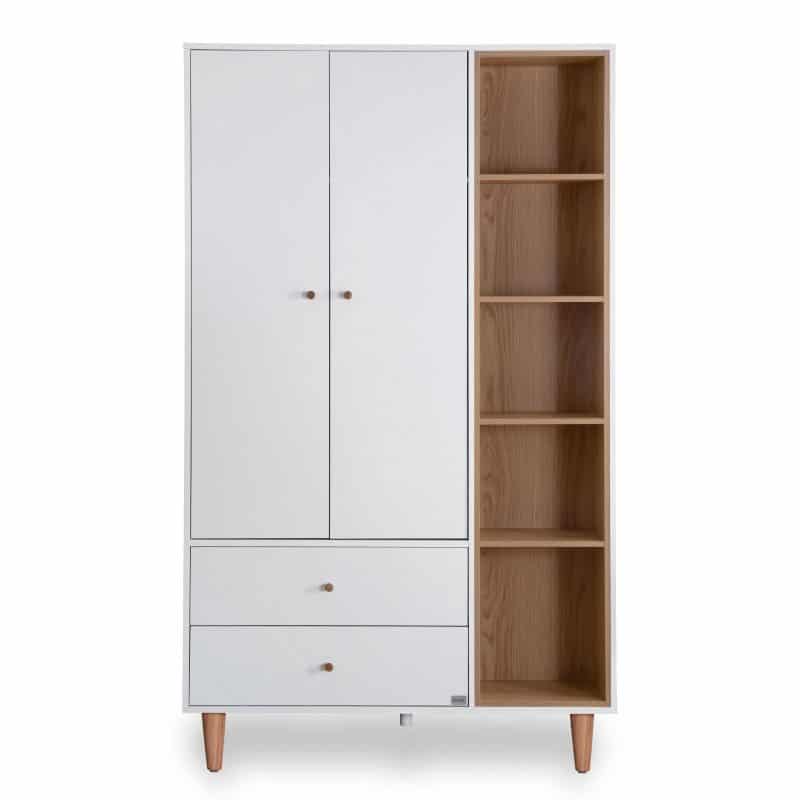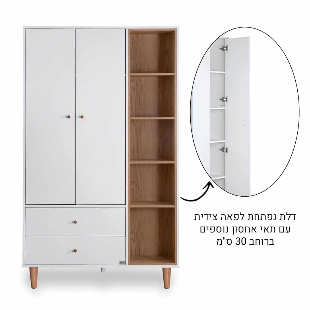 ארון מיקה הצליח לפצח ולהעניק מענה מושלם של עיצוב ופרקטיקה חכמה. הארון מעוצב עם 3 שטחי אחסון: ארון סגור, ספריה פתוחה עם 5 מדפים, ואחסון נוסף סגור בדופן הארון. עיצוב קלאסי של קווים נקיים וסטייל – שילוב של לבן טבעי צירי הדלתות של הארון מגיעים עם מנגנון של טריקה שקטה, השומרים על בטיחות התינוקות והילדים