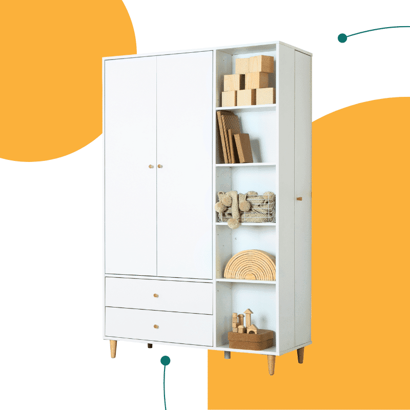 ארון ענבר משלב עיצוב מינימליסטי נקי עם פרקטיות חכמה, ומציע שלושה שטחי אחסון שונים: ארון סגור, ספרייה פתוחה עם 5 מדפים ותא אחסון נוסף בצד. עיצובו הקלאסי עם קווים נקיים וידיות לבנות משתלב בהרמוניה בחדרי תינוקות וילדים, תוך שמירה על תחושת מרחב ונינוחות. מנגנון הטריקה השקטה שומר על בטיחות הילדים, והחלוקה הפנימית הגמישה מאפשרת התאמה לצרכים המשתנים לאורך השנים.