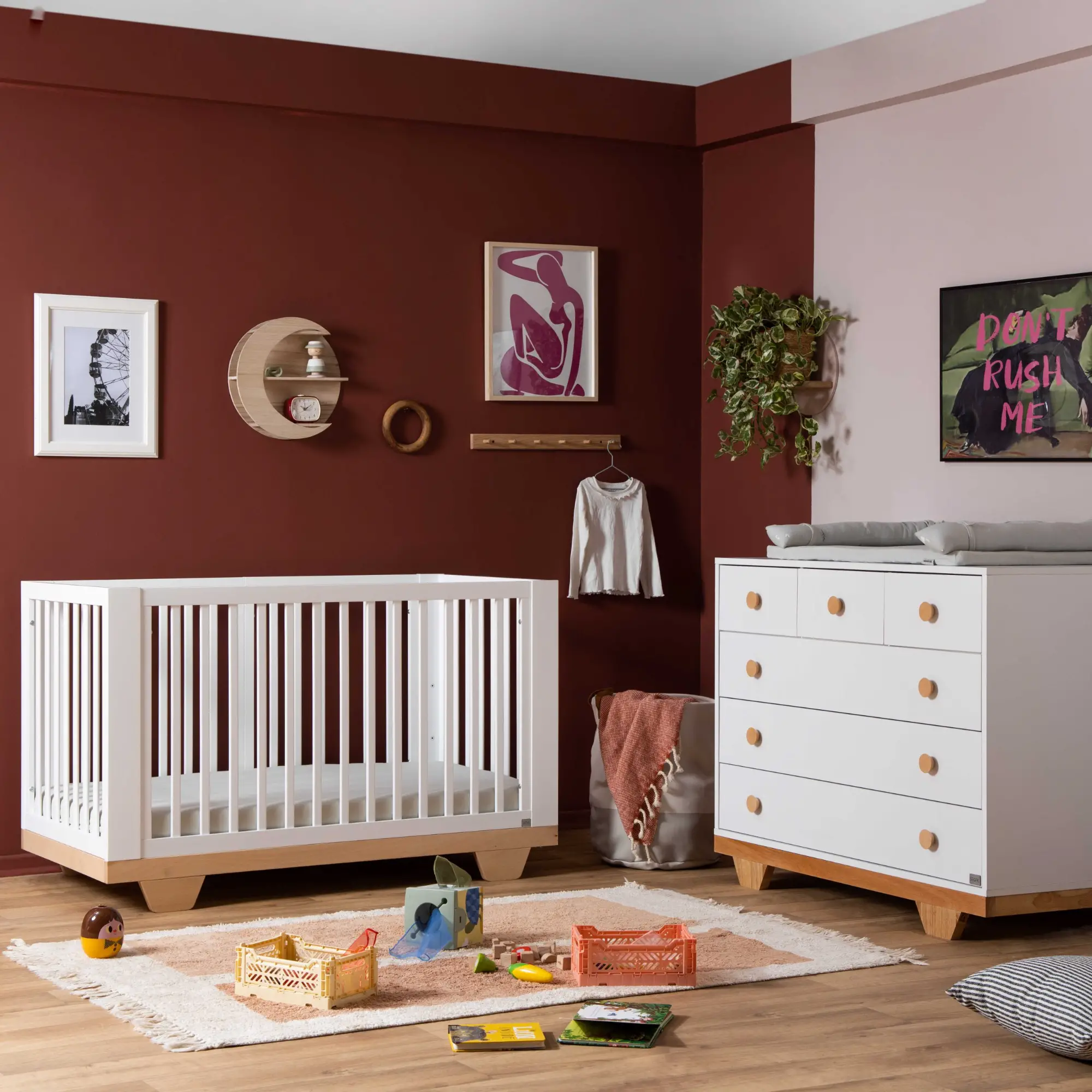 שידה רחבה באורך 120 ס"מ, בעיצוב אלגנטי ומינימליסטי בהשראת הטבע. השילוב בין עץ טבעי ללבן יוצר תחושה חמה ונעימה בחדר ומשרה אווירה רגועה. השידה כוללת שישה תאי אחסון גדולים, המאפשרים סדר וארגון עם מקום רב לציוד התינוק.