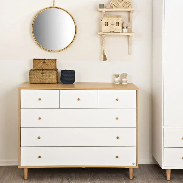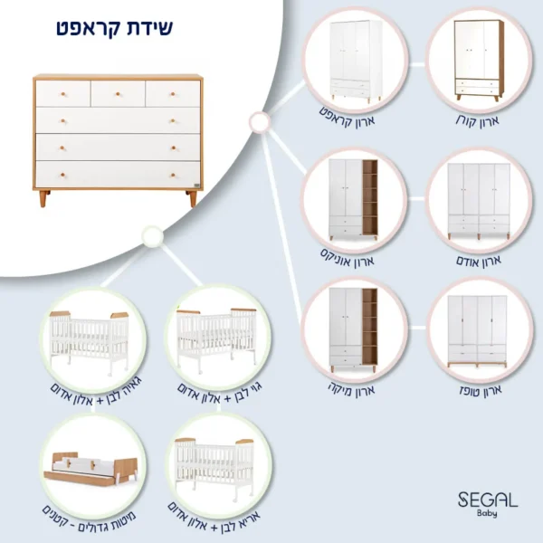 שידת קראפט היא שילוב מושלם של עיצוב בוהמיני מודרני עם קווים נקיים ומראה חמים שמשרה תחושת נינוחות בחדר התינוק. היא משלבת פונקציונאליות גבוהה יחד עם עיצוב אסתטי עכשווי, ומעניקה לכם נוחות שימוש לאורך שנים.