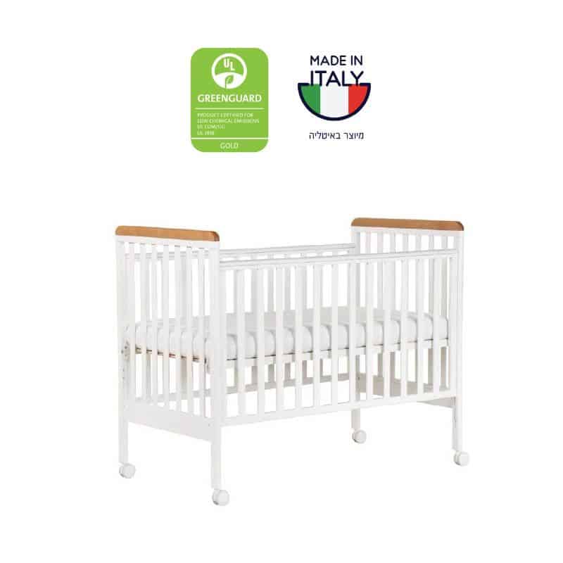 מיטה קלאסית ועדינה בעיצוב איטלקי על-זמני, המתאימה למגוון סגנונות חדרי תינוקות. עשויה עץ בוק מלא חזק ואיכותי, עם אפשרות לבחירה בגימור לבן מלא או לבן בשילוב אלון אדום.