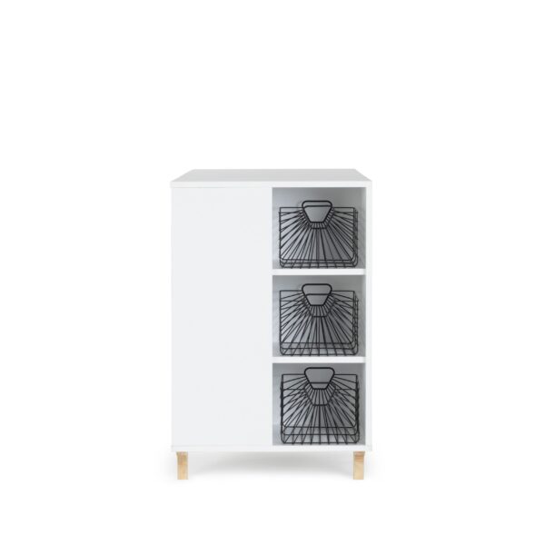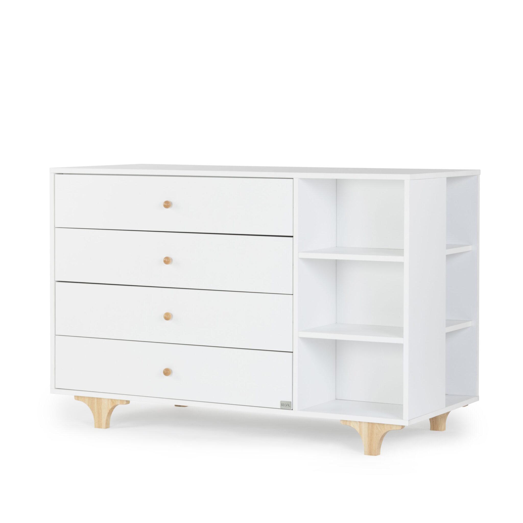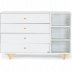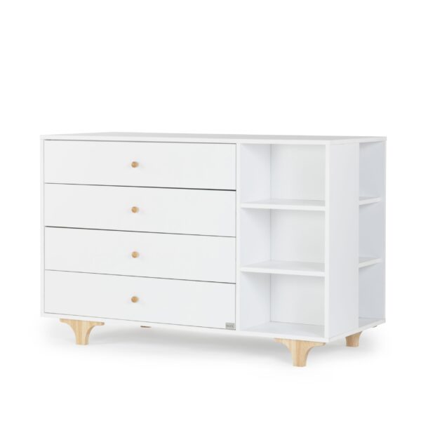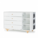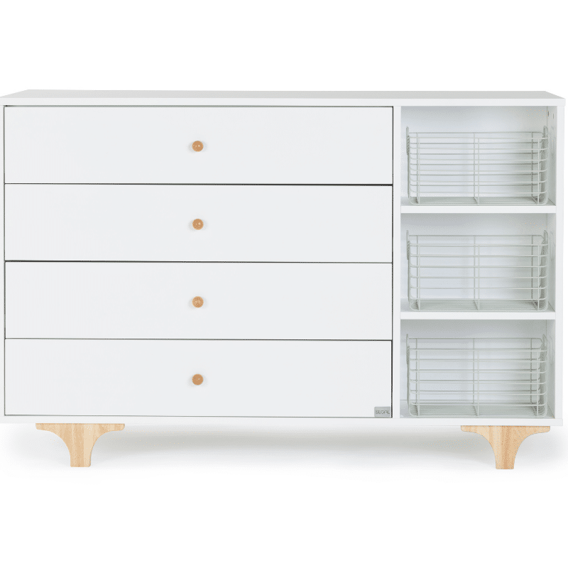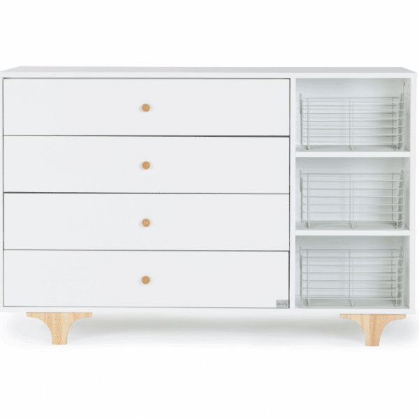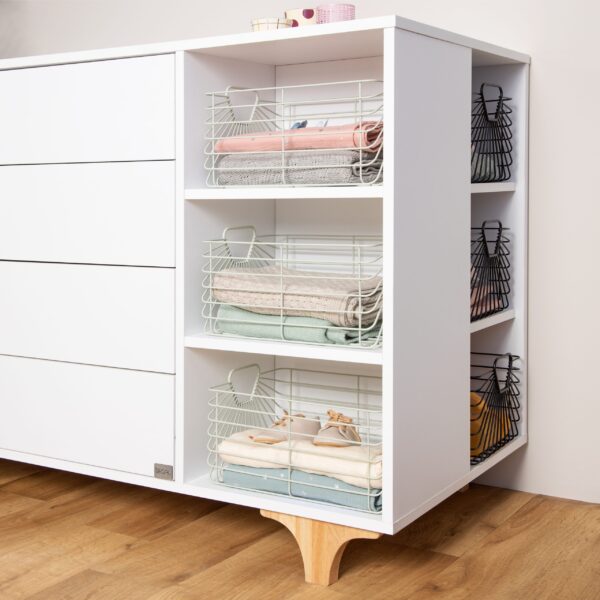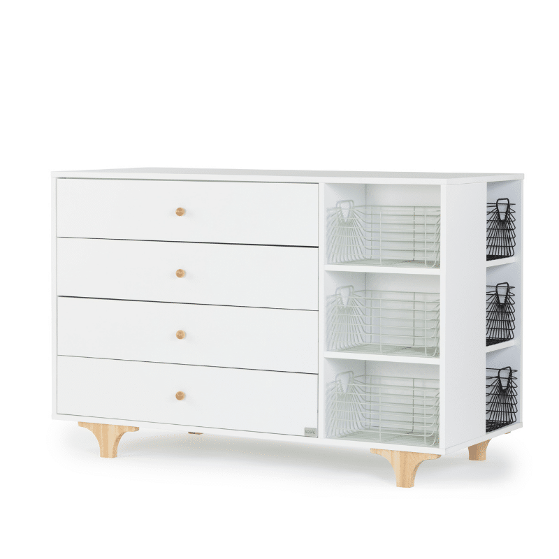 שידה רחבה במיוחד בעיצוב מודרני שמשלב פשטות נקייה עם נוכחות אסתטית. השידה משלבת מגירות סגורות ותאים פתוחים בחזית ובצד, מה שמאפשר אחסון פונקציונאלי לצד עיצוב מעודן. מגיעה עם 3 סלסלות מתכת לבנות המתאימות לשימוש במוצרים של הבייבי ובהמשך גם למשחקים וספרים.