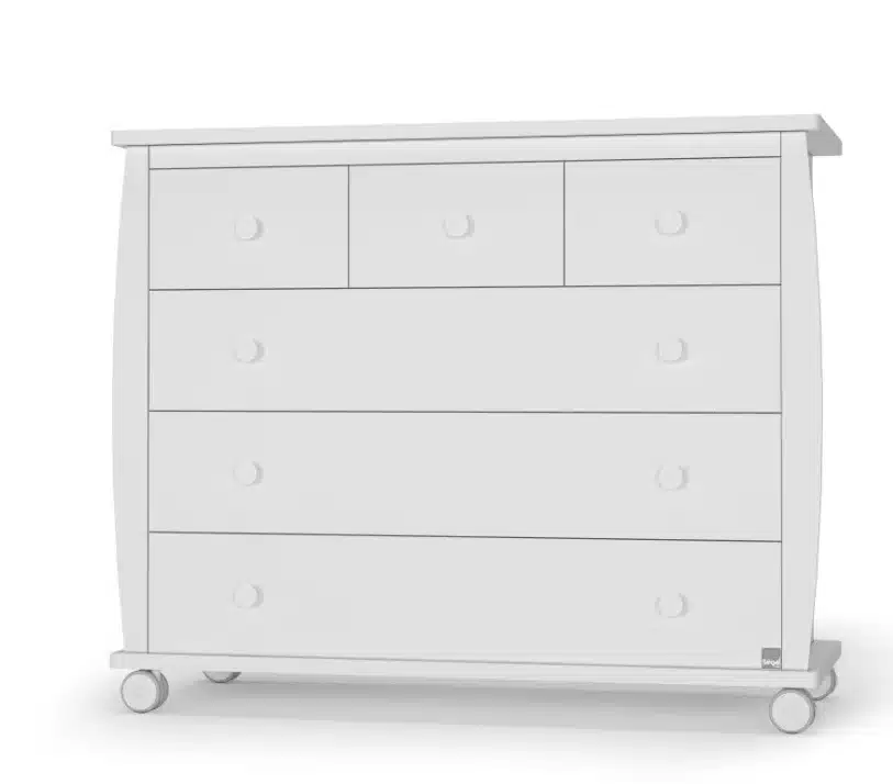 שידת אחסנה בעיצוב נקי ובחלוקת מגירות נוחה. עומק המגירות 60 ס"מ לניצול מקסימלי של מקום האחסון בשידה, המסילות בטיחותיות. חזקה במיוחד- משטחים מעובים ומשטח הטיפול מחוזק בפרופיל מתכת תומך. חיזוק משולש בגב השידה מבטיח עמידות לשנים רבות.